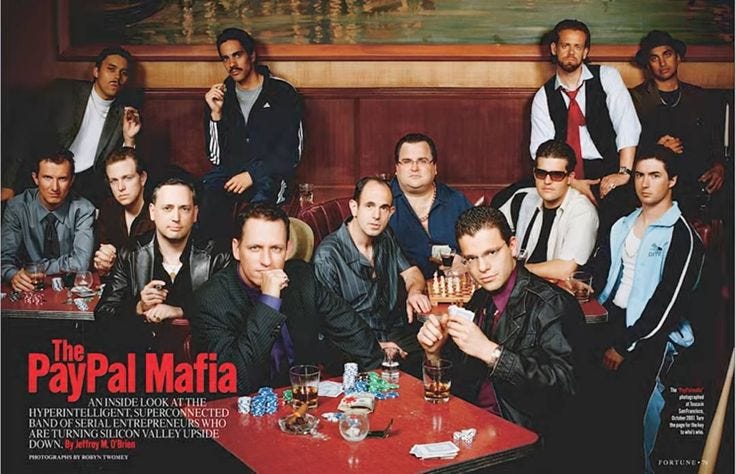 After eBay acquired PayPal in 2002, many of the early employees left and went on to found other influential tech companies. In 2007, Fortune magazine featured these alumni in an article dubbing them the “PayPal Mafia,” complete with a stylized photograph. The photo, with a mafia scene, was taken years after the PayPal sale and does not feature the same founding group, nor was it taken during the company’s early days. Elon Musk was not present for that photoshoot.